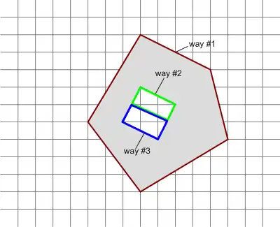 Multipolygons open up the possibility to create geometrically identical objects in different styles: as ways or as multipolygons, using closed or open ways, or with shared or unshared ways. This raises the question of which mapping style to use. Some styles have advantages over others, and should be regarded as good practice. For others, the choice is more of a matter of preference, or whether one is an experienced or an inexperienced mapper.