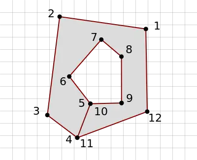 | This is an example of an invalid multipolygon as node 4 and 5 are reused as 10 and 11. According to Open Geospatial Consortium’s (OGC) OpenGIS rules, this is not a valid polygon. It will create an error note in the Osmose quality assurance tool. | ![]() |