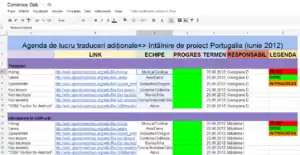 - În prima imagine este agenda de lucru pentru atelierul de traduceri ce avea ca sarcină de lucru, Întrebări frecventeși Ghidul începătorului , așa cum arăta în decembrie 2011.Se poate observa că unele traduceri sunt terminate și deja introduse, altele în progres, iar altele de făcut în continuare.
