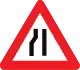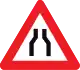 Road narrows (about 150m after the sign) | Sometimes traffic_calming=chicane or traffic_calming=choker on part of the way (this sign can be used for other kinds of narrowing than traffic calming)