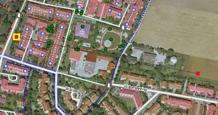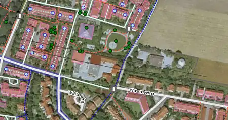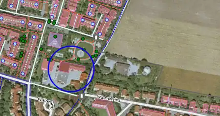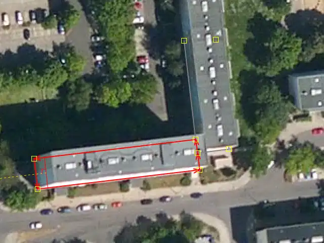 In case of free-standing buildings without reference to the street, the position error is reduced by a shift of half the distance between the lowest and highest position one as the outline for on the aerial photograph visible corner building on the site selected.