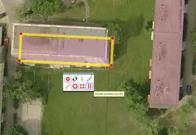 We draw on the best long, side of the building and make a copy of the polyline with the command: "create parallel way", (shortcut P).