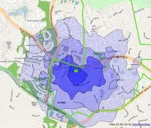 To show this on a map, I have another Python script which takes a start point via HTTP POST (walk.py?startpoint=$lon $lat), finds the nearest vertex, computes the SPT using driving_distance(), creates the filled contours, and spits out GeoJSON for consumption and display by OpenLayers.