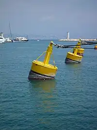 Mooring buoy buoy A buoy secured to the bottom by permanent moorings with means for mooring a vessel by use of its anchor chain or mooring lines.