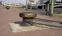 Bollard bollard Small shaped post, mounted on a wharf or dolphin used to secure ship's lines.