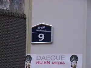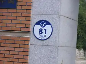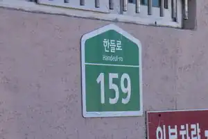 These signs generally have the address number in large white numerals and the street name in Hangeul and English on a blue background. Public buildings often have a circular sign, and some color and shape variants can be found.