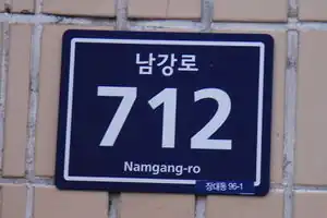 addr:housenumber=712addr:street=남강로A rectangular sign in Seoul. |