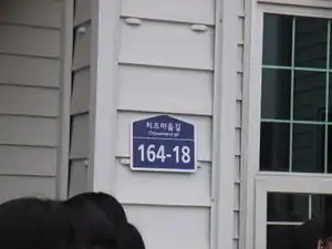 In 2009 the Korean government introduced a new street naming scheme. Across the country new street signs were installed and new house number plaques were distributed. See Korea Streetsigns history for a discussion of the history of Korean streetsigns and addresses. You will find that most name tags in Korea are still tagged with Hangeul and English (in brackets) the name tag. The convention recently changed, please follow these rules now and help the manual transition.