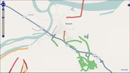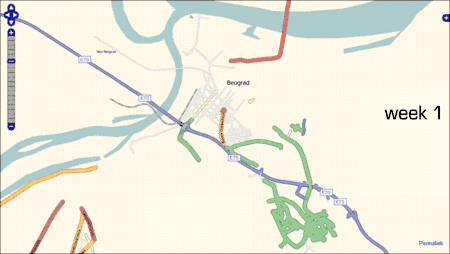 First week status from permalink http://www.openstreetmap.org/?lat=44.7977&lon=20.4669&zoom=13&layers=B0FT: