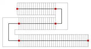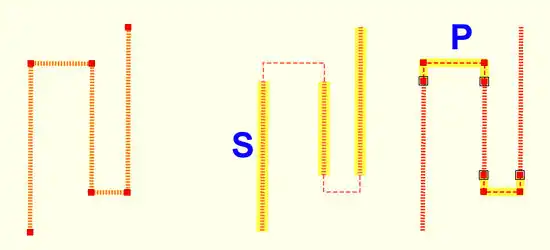 Möchte man Treppen mit Zwischenpodesten erhalten, was für längere Treppen überwiegend Standard ist, so muss man einen OSM Grundriss wie in unterem Beispiel konstruieren: Anstatt einer Polylinie mit mehreren Zwischenpunkten wird pro Relation eine miteinander verknüpfte Abfolge von Treppen (S) und "Podestlinien" (P) konstruiert.