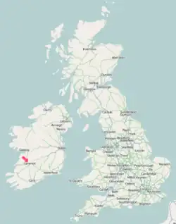 The closest international airport is Shannon (SNN), then Galway (GWY), Cork (ORK), Waterford (WAT), Dublin (DUB), and Belfast (BFS).