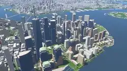 The project is written in Typescript. The rendering uses a custom low-level library that wraps the WebGL2 API, and for managing the rendering pipeline it uses a render graph (or frame graph) implementation. Geometry generation is done on the fly; supported map features include but are not limited to complex building shapes (according to the de-facto standard Simple 3D Buildings schema), roads and paths, trees, etc. Data is loaded from the Streets GL vector tile server.[2] It features complex post-processing effects such as dynamic time of day.