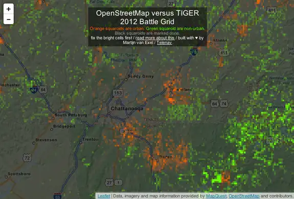 The TIGER Battlegrid ([2]) uses TIGER 2012 data to make a broad brushstroke comparison to indicate large areas (grid squares) where OpenStreetMap data seems to be most heavily out of whack. Usually this reveals areas where the OSM data is out of alignment with reality because it's an area of particularly poorly aligned data from the older TIGER dataset, where nobody has done any TIGER fixup work. Use the Battlegrid tool to locate these areas and fix things up! However when you come to work on fixup at the detailed level you may also like to use...