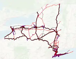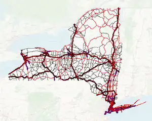 New York State Highways: 3, 5, 7, 8, 9A, 9G, 9H, 10, 12, 12A, 13, 14, 15, 16, 17, 21, 22, 23, 24, 25, 26, 27, 28, 29, 30A, 31, 32, 33, 33A, 35, 36, 37, 39, 42, 50, 52, 56, 58, 59, 60, 63, 77, 78, 100, 104, 109, 130, 149, 179, 199, 204, 205, 231, 263, 303, 332, 365, 370, 384, 408, 481, 495, 812, 878
