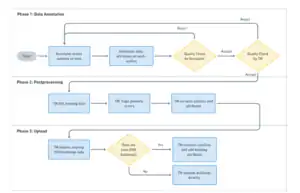 The data annotation process begins with drawing outlines on a tile. After the outlines are drawn, the annotator adds specific attributes to each of these outlines. To ensure the quality and accuracy of the annotations, there are two levels of quality checks involved. The first quality check is done by the annotator themself, after which the data can either be accepted or rejected. If accepted, it undergoes a second quality check on a sample of 10% of all buildings. For both quality step checks in this phase, a rejected tile goes back to the annotator for needed corrections.