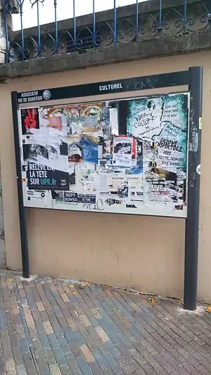 Small billboard for neighbourhood advertising, generally intended for pedestrians, but some of them can be along roads. Some of them are open to any fly posters, and not private.