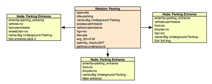 - More than one entrance might be grouped into a single parking facility by using a site relation. See example below and Relation:site for details.