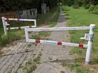 Cycle barriers (or pedestrian chicanes) are fence-like barriers positioned along paths, footways, cycleways or tracks which serve to either slow cycle access or prevent it entirely depending on spacing and layout. Often made of steel, and laid out in a staggered chicane layout. The intent may also be to discourage motor vehicle access to the protected way: motorcycles and mopeds specifically.