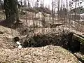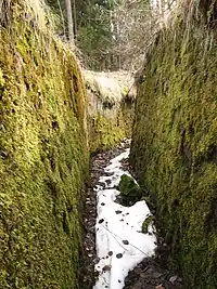 | A ditch or a trench is a long and narrow man-made barrier dug in the ground to prevent access to the other side. |