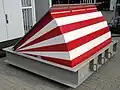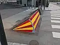 A wedge barrier (also called a rising kerb or hydraulic road barricade) is a kind of retractable barrier, shaped like a wedge or flap, that is level with the road surface until it automatically rises out of the ground to physically block all traffic from passing through. Wedge barriers are typically installed at checkpoints (military=checkpoint, police=checkpoint) and other high-security locations.