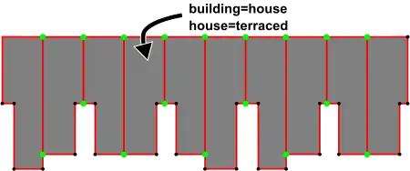 This tag is most commonly used as a less-detailed option to define the outline of a linear row of residential dwellings which form a