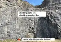 climbing= marks the start (usually the bottom) of a climbing route. It is used for climbers to access the start of their ascent outdoors. It usually holds a name=* and a difficulty grading (see Climbing#Grading).