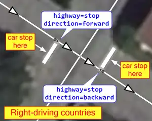 Since the stop line on the approach applies to only one travel direction, that direction can usually be deduced by finding the shorter distance to the priority intersection. However, a few stop signs are on 2-way streets between closely-spaced junctions, making it necessary to identify the travel direction that stops. Where needed, this can be done using direction=forward or direction=backward, relating stop direction to OSM forward/backward of the way that contains the highway= node.