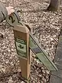 | A small pole, erected vertically, with information or images on the top or sides, or on a small plaque. |
