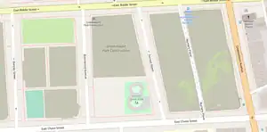 The roadway along this block remains in tact and connected to the surrounding road network, but all the houses which used to stand along it have been demolished. For a period of time this site was leased to a community organization to operate an urban farm, but has since become disused again. The vegetation overgrowth you can see developing here consists of short-statured plants which could be mapped as natural=scrub.Easternmost block in image to the right, shown in context. |