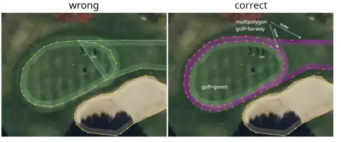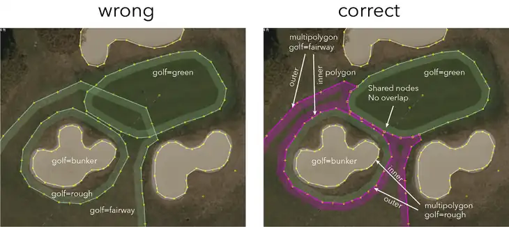 8. Overlapping green/fairway/rough polygons (see graphics below). If there is no fringe, or the imagery isn't clear enough to say one way or another, butt the fairway and green together and share nodes. If there is a clear "fringe" around the green, the fairway should extend around the green and be combined with the green into a multipolygon.