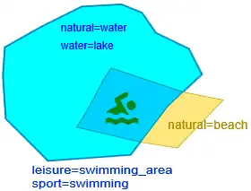 Note that this tag should only be used to map the part of the water that's designated for swimming, and should not include surrounding areas (like the beach or any facilities). Historically, this tag has been used as the primary tag for a bathing place by some mappers, but this usage is discouraged, and existing such cases should be adjusted to also include an object tagged with leisure=bathing_place, leisure=beach_resort or amenity=public_bath (see Disambiguation).