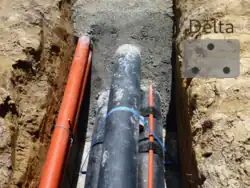 Three underground power cables installed in black ducts, arranged in a delta shape. Orange ducts may be optical fibre or telecom wires. This example only covers the black ducts. |