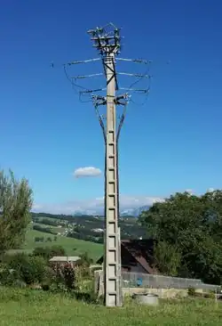 A particular situation becoming common thank to networks burying: an old overhead switch anchor pole has been refurbished to split the original overhead line in two sections and connect them to underground cables toward an indoor switching busbar. It's a split since two cables coming from a same origin go different overhead directions. |