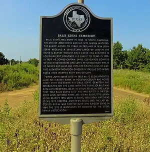 historic=memorialmemorial=name=Balis Edens Cemeterymaterial=aluminiumsupport=postoperator=Texas Historical Commissionoperator:wikidata=Q2397965ref:thc=11230openplaques:id=23356