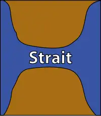 A strait is a narrow area of water surrounded by land on two sides and by water on two other sides forming a connection between those bodies of water. Typical cases include passages between islands or connections of bays and gulfs to the open ocean. Straits are significant and often named features as either sea travel routes, for water exchange or as fish migration routes.