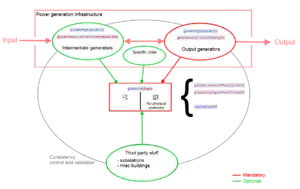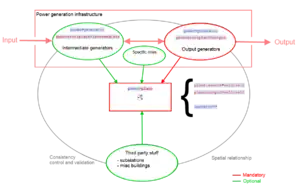 power=generator, a device which converts one form of energy to another, for example, an electrical generator.power=substation, a facility which controls the flow of electricity in a power network with transformers, switchgear or compensators.ref:EU:ENTSOE_EIC=*- Proposed features/Power generation refinement, the approved proposal.