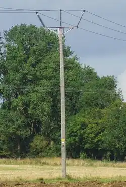A single (often wooden or concrete) pole (IEV ref 466-07-01) carrying low voltage, medium voltage, or high voltage lines (usually of the distribution or subtransmission level). Usually composed of the pole itself and cross-arms, or only the pole, with insulators placed on the pole itself.