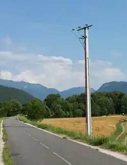 At the centre of the picture: a wooden pole on 115 kV power line | |