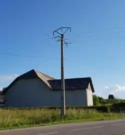 Possible key for poles or small masts of overhead power lines with low- or medium-range voltages between about 0.4 and 30 kV. 0.4 kV lines (such as the one in the third image of the four examples) are still often found in small towns and villages. Outside villages in rural areas, the medium-voltage net is also often made of overhead lines on poles or small masts. At the terminal masts, the line either changes to an underground cable or goes into a transformer which steps down to about 400 V.