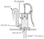 A piston pump used to get water by manually raising and lowering the lever. The piston is located underground and move water towards the faucet and then outside of the well |