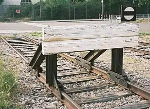 | Barrier that exists on a railway to prevent trains from running off the end of the tracks. |