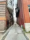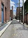 Alley streets are a road classification found in Baltimore, Maryland, USA[3], and potentially other places. Alley streets are alleys by definition, i.e., they serve the rear of buildings, but are named. Most named alley streets have addresses assigned to them, often small homes or carriage-houses that have been converted into homes, due to Next Generation 911 (NG911) standards that require local governments to sign any public street with addresses. Alley streets may have sidewalks but they are small and designed to house trash cans or steps down from homes. Alley streets do not typically have on-street parking, which distinguishes them from residential streets.