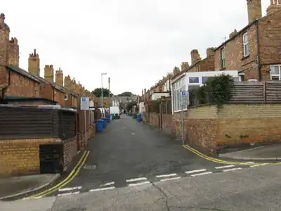 An alley or alleyway is a narrow highway=service road usually located between properties to provide access to back gardens, rear entrances, fire exits, and storage areas. Alleys are normally found in urban areas and often run between the rear sides of buildings such as houses and commercial premises.