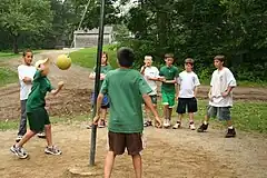 | Tetherball is a game where two players use their hands to strike a volleyball which is suspended from stationary metal pole by a rope or tether. |