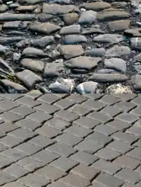 Paving stones have relatively smooth surface. The surface is paved with artificial blocks (block pavers, bricks) or natural stones (flagstones), with a flat top. The gaps between individual paving stones are very narrow, either because the stones have a perfectly regular shape (rectangular, or any surface-filling shape) or because they have been carefully selected, fitted and placed in order to form an even, closed surface. |