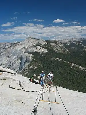 surface=stepping_stones + material=granite for stones or plates individually arranged in a row, allowing to walk on, surrounded by an unpaved medium such as grass or water
