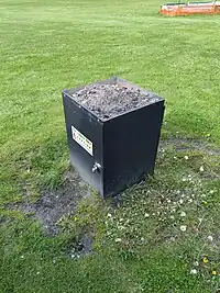 A container for the disposal of ash. Common where people grill to prevent fires though improper disposal.