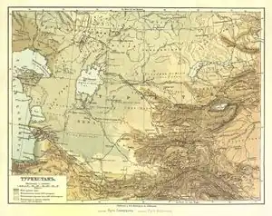 A 19th-century map of "Turkestan" after its conquest by the Russian Empire.