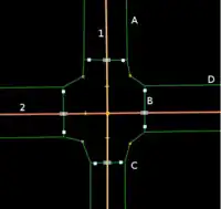 У цьому прикладі, якщо ви використовуєте зв’язки, вам треба створити зв’язок для вулиці з проїзною частиною "1" з роллю street, додати вертикальні тротуари з роллю sidewalk. У цьому випадку, всі пішохідні переходи належать обом вулицям, тож їх треба додати до зв’язку також з роллю sidewalk. Невеличкі заокруглення між вдома переходами також належать обом вулицям, тож їх потрібно відділити й також додати у зв’язок. Так само для вулиці "2", де проїзна частина та тротуари проходять горизонтально. |