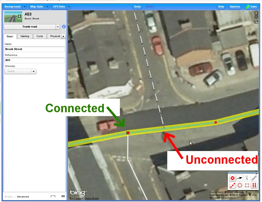 | Incorrect - ways are not connected | Correct - ways share a common node | |